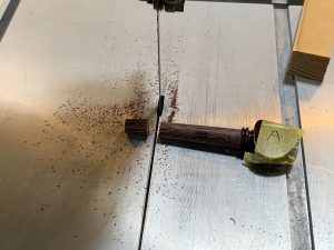 余分な部分をバンドソーで切断して、切断面を研磨、弦を通す穴を開けてペグの加工は完了です。