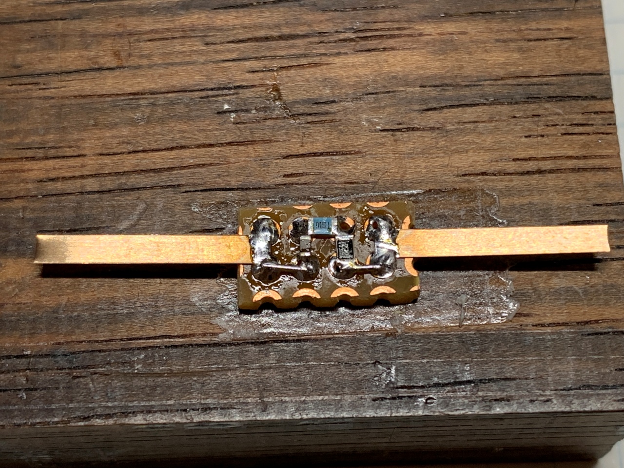 穴開き基板にLED用の抵抗と、スナバ回路を構成する抵抗とコンデンサを取り付けて通電版となるリン青銅板(0.1mm)を細く切って取り付けています。